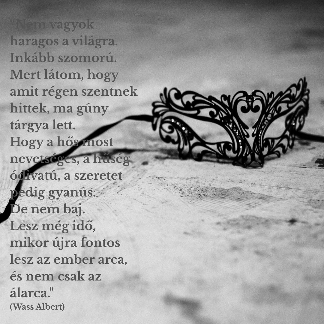 „Nem vagyok haragos a világra. Inkább szomorú. Mert látom, hogy amit régen szentnek hittek, ma gúny tárgya lett. Hogy a hős most nevetséges, a hűség ódivatú, a szeretet pedig gyanús. De nem baj. Lesz még idő, mikor újra fontos lesz az ember arca, és nem csak az álarca.” (Wass Albert)